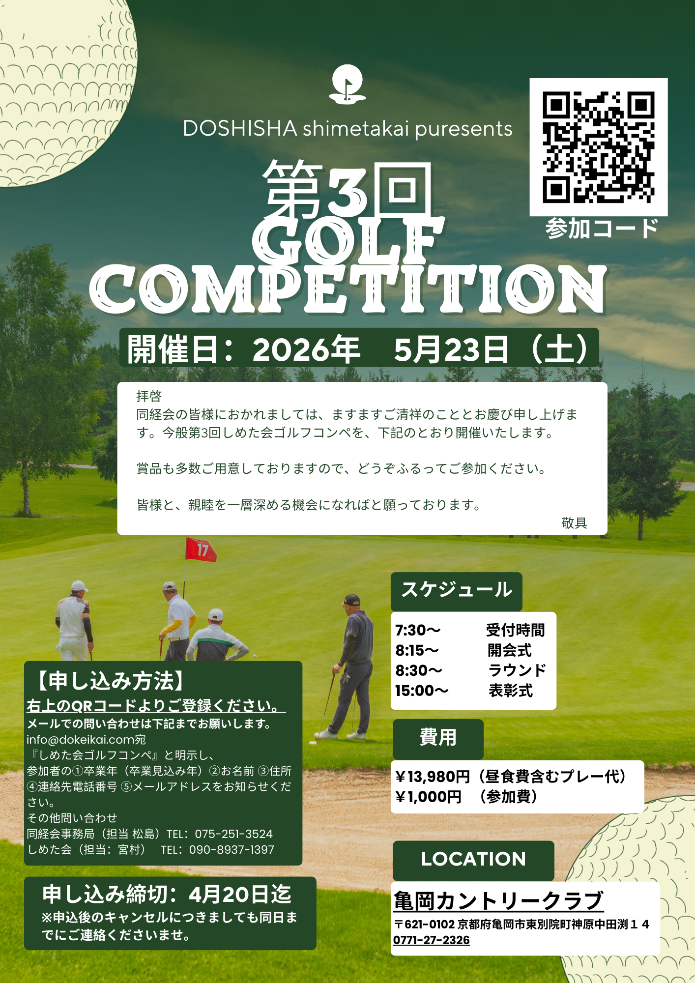 日頃より同経会の活動にご理解とご協力を賜り、誠にありがとうございます。 このたび、会員の皆さまの親睦を深める恒例行事として、 「第3回しめた会ゴルフコンペ」を開催いたします。 ゴルフを通じて旧交を温め、新たな交流を育む絶好の機会です。 初心者の方からベテランの方まで、どなたでもお気軽にご参加いただけます。 ぜひ奮ってご参加ください。 ■ 開催概要 日 程:2026年5月23日(土) 会 場:亀岡カントリークラブ 〒621-0102 京都府亀岡市東別院町神原田畑14 TEL:0771-27-2326 費用:13,980円(昼食代・プレー代含む)+ 参加費 1,000円