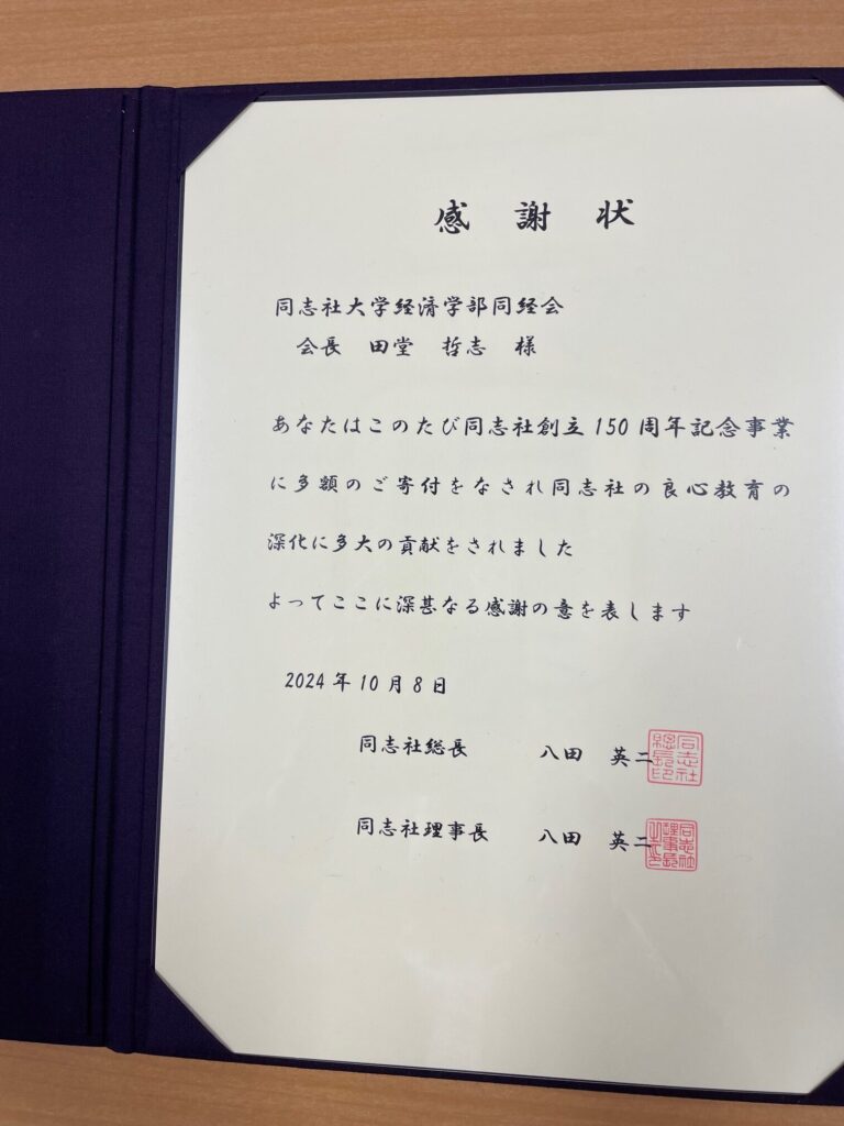 「同志社創立150周年記念事業 新島襄アニメ」に寄付をしました